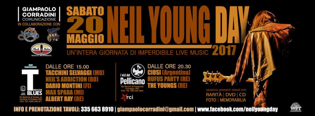 Sabato 20 maggio è la giornata dedicata a Neil Young e a Crosby, Stills & Nash – a partire dalle ore 15,00 – presso il Tabacchi Blues, in via Madonna di Pompei, angolo via Fontana a Rubiera (RE) e – dalle ore 20,30 – a I Vizi del Pellicano, via Ronchi di Fosdondo, 11 a Correggio (RE) si terrà la decima edizione del NEIL YOUNG DAY, il bellissimo evento creato da Giampaolo Corradini, grande appassionato del “Loner” canadese, capace di regalare allo stesso la giusta motivazione che l’ha resa così importante a livello nazionale. Il folto pubblico che giunge da ogni parte d’Italia, le tante band che si esibiscono non imitando, ma interpretando Young, i banchetti con oggettistica varia, dischi e CD rari, magliette a tema, foto e rarità ma, soprattutto, la grande amicizia e la piacevolezza di ritrovarsi sempre più numerosi ogni edizione hanno fatto sì che l’evento sia particolarmente amato ed atteso. A-Z Blues e il Rootsway Festival da quest’anno si affiancano a Corradini e a tutto lo staff organizzativo con un grandissimo onore e piacere con l’intento di promuovere ulteriormente questo Neil Young Day poiché assolutamente convinti che una manifestazione come questa possa solo giovare alla promozione della grande musica.