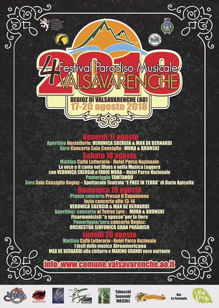 Per l’edizione 2018 del Festival Paradiso Musicale il progetto si estende ulteriormente, oltre a comprendere sempre dei gruppi che si esibiranno in località Degioz il venerdì sera ed il sabato sera, durante il pranzo legato alla Fiha di -s-Artisa, un duo acustico di musica tradizionale itinerante per tutto lo svolgimento della fiera stessa, sia spaziando verso alter forme d’arte con alcune conferenze- caffè letterari su temi musicali legati ai diritti umani, nonché infine ben due aperitivi musicale di “avvio/benvenuto”, il primo presso l’Hostellerie du Paradis in località Eaux Rousse e l’altro ai piedi del Grande Etret a fondovalle, press il rifugio Tetras Lyre.