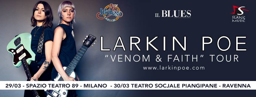 Dopo aver incantato il pubblico provenuto da tutta Italia con un concerto che ha registrato un grande successo di pubblico e critica, tornano in Italia le LARKIN POE per due imperdibili date: il 29 Marzo c/o Spazio Teatro 89 – Milano (MI) e il 30 Marzo c/o Teatro Socjale – Piangipane (RA). I biglietti dei concerti, prodotti e organizzati da Slang Music in collaborazione con A-Z Blues, sono disponibili su VivaTicket (vendita on-line e lista completa punti vendita su www.vivaticket.it).