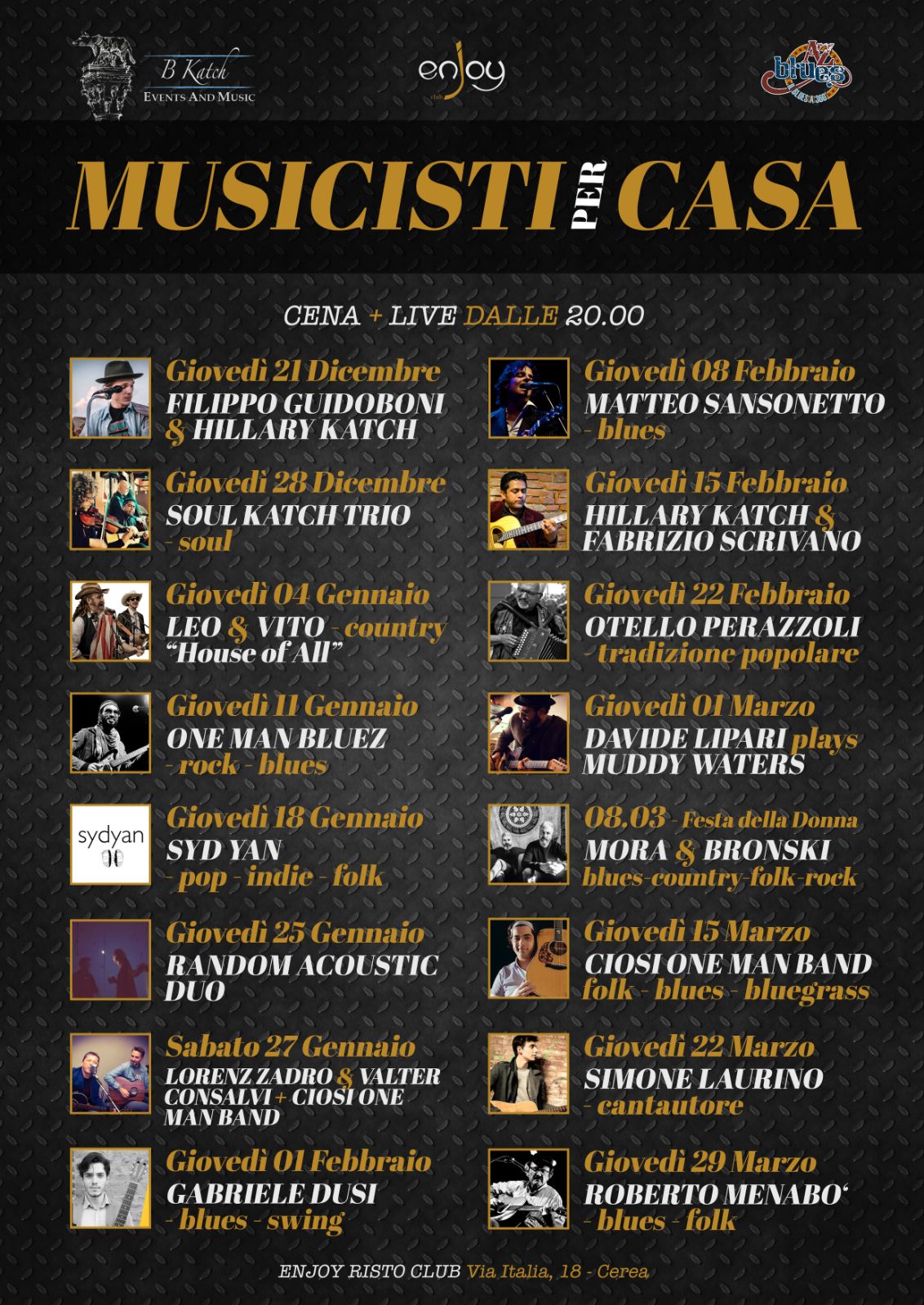La rassegna prevede i seguenti appuntamenti: Filippo Guidoboni & Hillary Katch (giovedì 21 dicembre), Soul Katch Trio (giovedì 28 dicembre), Leo & Vito degli House Of All (giovedì 4 gennaio), One Man Bluez (giovedì 11 gennaio), Sydyan (giovedì 18 gennaio), Random Acoustic Duo (giovedì 25 gennaio), Lorenz Zadro & Valter Consalvi feat. Ciosi (sabato 27 gennaio per una serata “special blues all night long”), Gabriele Dusi (giovedì 01 febbraio), Matteo Sansonetto (giovedì 08 febbraio), Hillary Katch & Fabrizio Scrivano (giovedì 15 febbraio), Otello Perazzoli (giovedì 22 febbraio), Davide Lipari plays Muddy Waters (giovedì 01 marzo), Mora & Bronski (giovedì 08 marzo per una serata dedicata alla Festa della Donna), Ciosi (giovedì 15 marzo), Simone Laurino (giovedì 22 marzo) e Roberto Menabò (giovedì 29 marzo).
